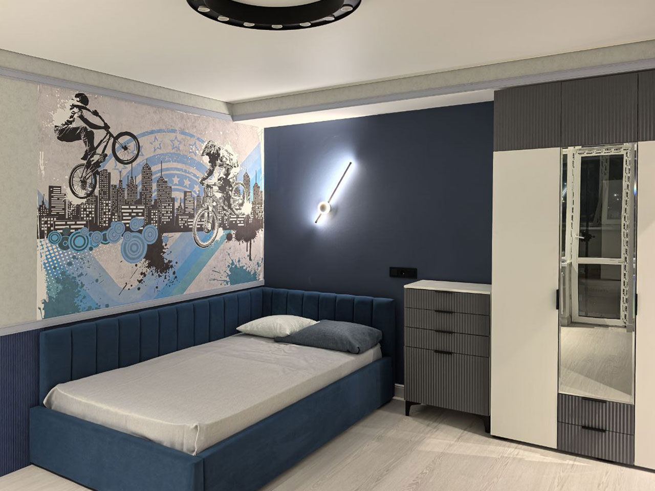 Начнем с детской для мальчика. Здесь царит атмосфера приключений благодаря сюжету с велосипедистами (Арт.34643) из нашей дизайнерской коллекции «Free time». Чувствуется энергия движения, свобода и жажда открытий - все то, что так важно для юных исследователей мира!